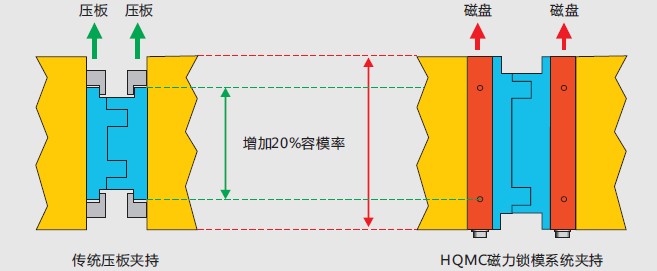 注塑機模板在同一尺寸條件之下,使用壓板夾持時(shí),需一定空間做為壓板固定施力點(diǎn),大幅壓縮模具夾持空間;HQMC磁力鎖模系統則在機臺最大與最小模具容模范圍內尺寸,皆能夾持無(wú)須變更任何結構,徹底發(fā)揮注塑機夾具最大極限效果。