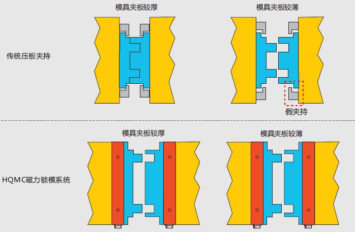 在生產(chǎn)過(guò)程中, 模具夾板因厚薄變化, 若使用壓板夾持時(shí), 常讓操作人員浪費過(guò)多時(shí)間挑選合適壓,HQMC磁力鎖模系統因采取全模具接觸面夾持方式,所以無(wú)模具夾板厚度問(wèn)題,且避免造成“假夾持”潛在危險情形發(fā)生,充分達到全面夾持應用效果。